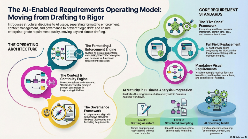 Over the past year, I’ve been designing what I call an AI-Enabled Requirements Operating Model — a structured approach that moves AI from “helpful drafting assistant” to a disciplined enterprise engine.
